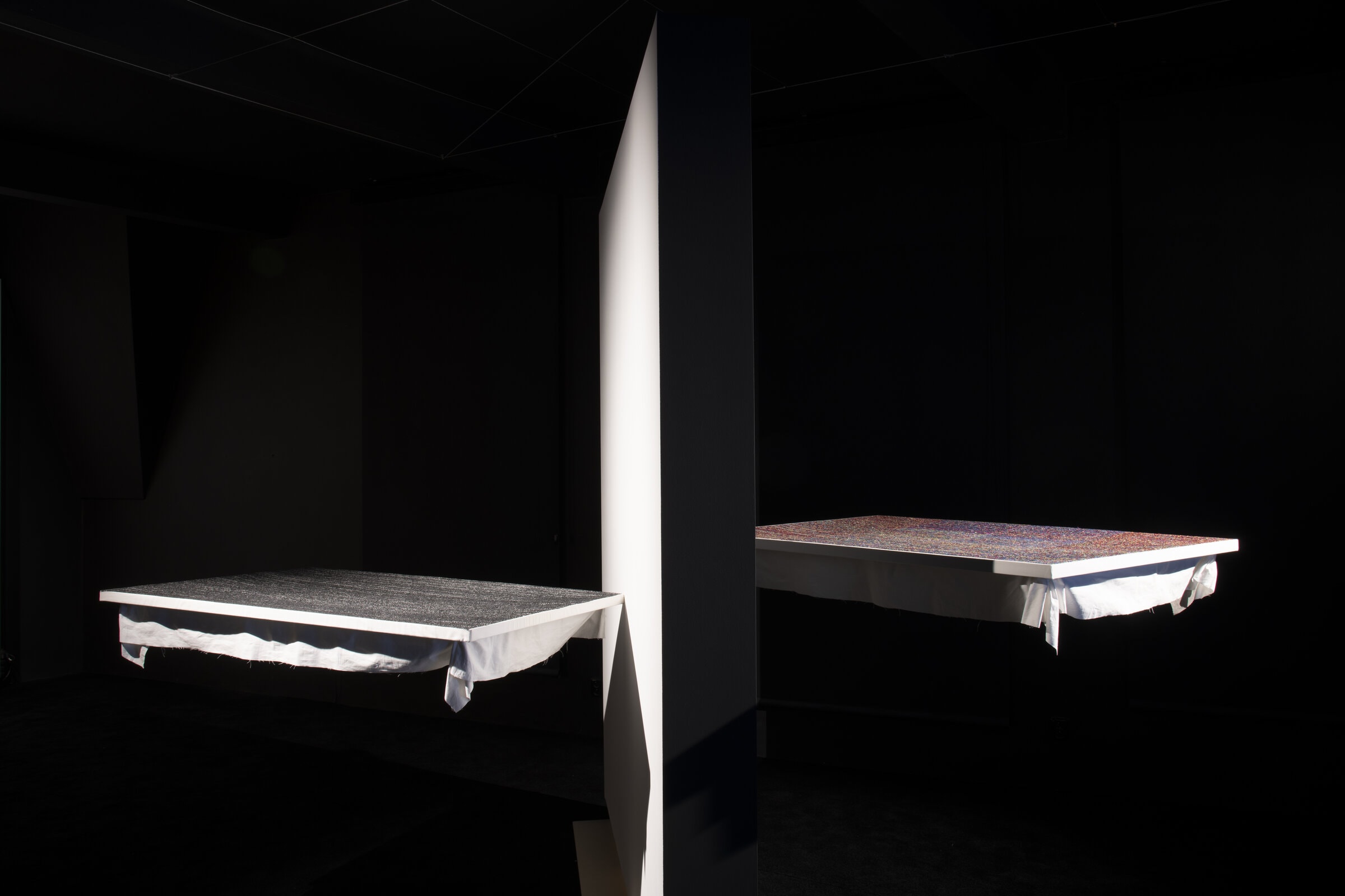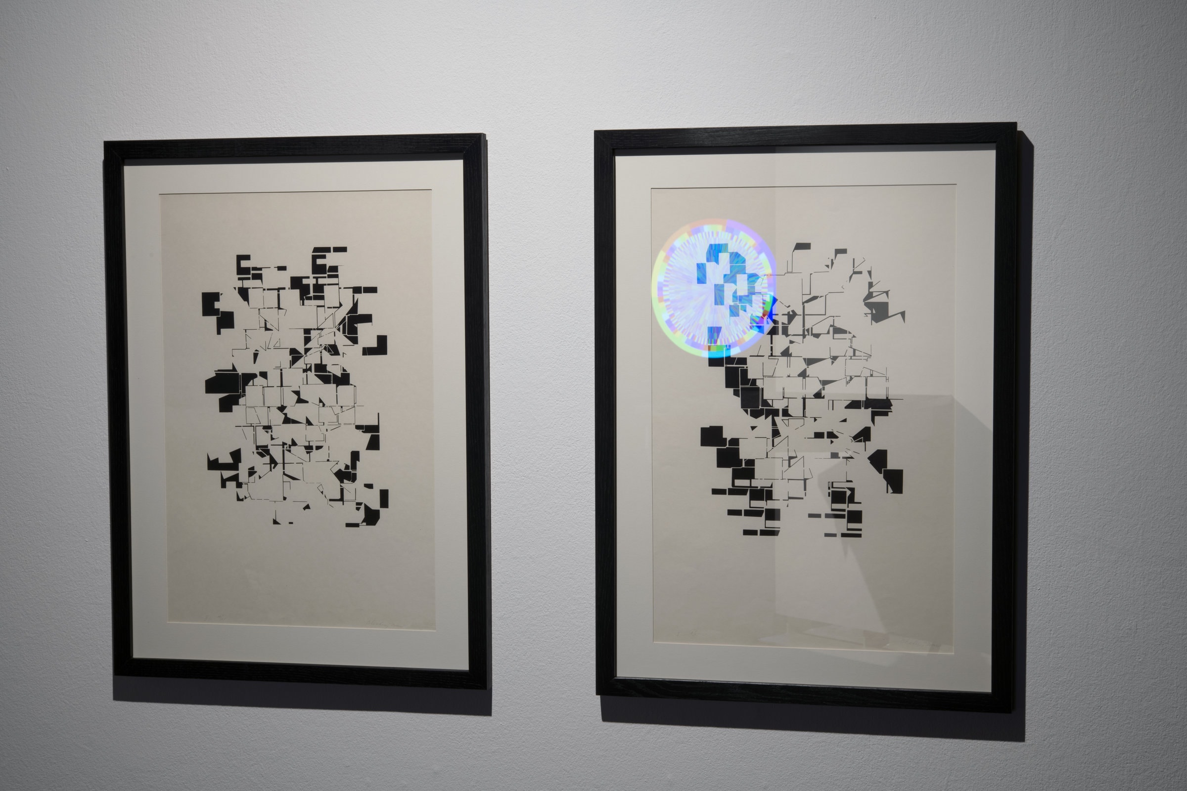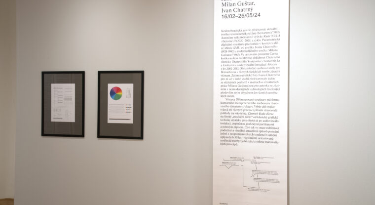 V POPŘEDÍ: Jana Bernartová, RASTR NULA #HEROINE II Z CYKLU PARAMETRICKÁ DIGITÁLNÍ STRUKTURA (2020–2021); V POZADÍ: díla Ivana Chatrného, ORCHESTRÁLNÍ KOMPOCICE I (1969); ORCHESTRÁLNÍ KOMPOCICE II (1969)