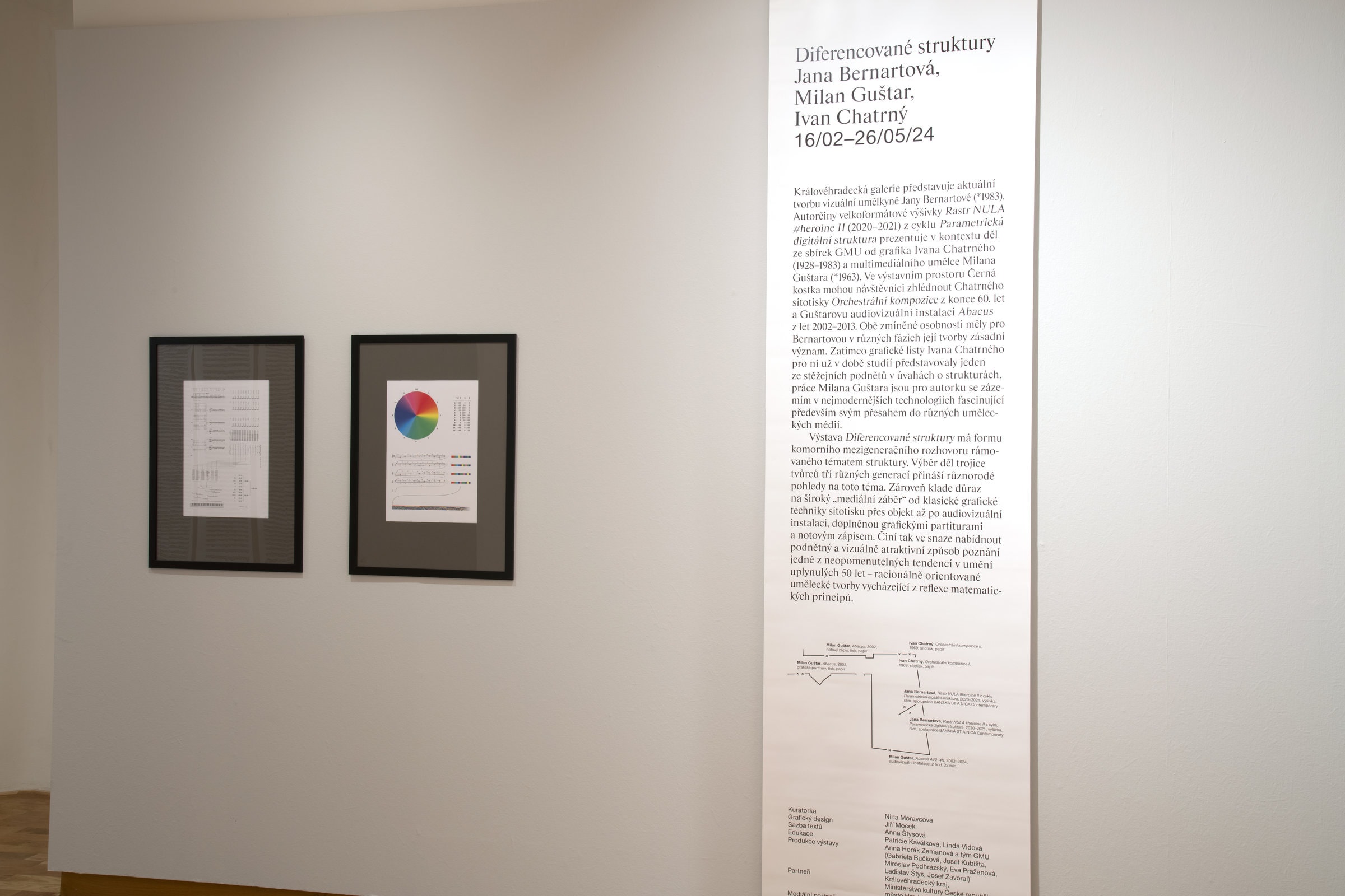 Výstava Diferencované struktury má formu komorního mezigeneračního rozhovoru rámovaného tématem struktury. Výběr děl trojice tvůrců tří různých generací přináší různorodé pohledy na toto téma. Zároveň klade důraz na široký „mediální záběr“ od klasické grafické techniky sítotisku přes objekt až po audiovizuální instalaci, doplněnou grafickými partiturami a notovým zápisem. Činí tak ve snaze nabídnout podnětný a vizuálně atraktivní způsob poznání jedné z neopomenutelných tendencí v umění uplynulých 50 let – racionálně orientované umělecké tvorby vycházející z reflexe matematických principů. Ačkoliv by se volba prezentovaných děl mohla na první pohled zdát založená pouze na formálních východiscích (repetetivní řazení vybraných prvků do podoby struktur či rozvíjení principu sériovosti), cílem výstavy je poukázat na jejich obsahovou vrstevnatost i aspekty, které do současného výtvarného umění vnáší práce s nejmodernějšími technologiemi.