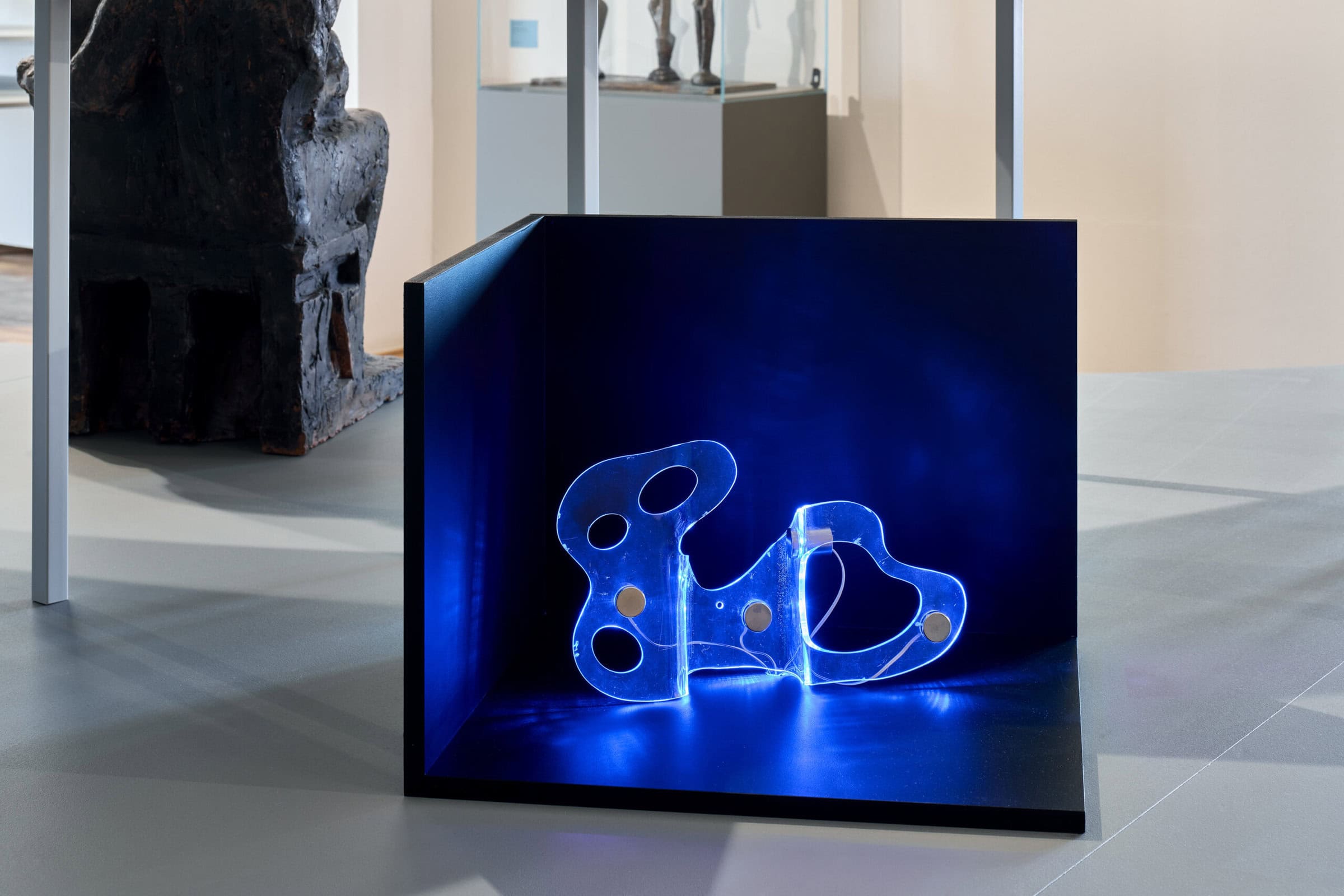 ZLEVA: Henry Moore, MAKETA PRO NÁSTĚNNÝ RELIÉF Č. 3 (1955); Sylva Lacinová, KVĚT (1973); Rudolf Chorý, FÉNIX (1964)