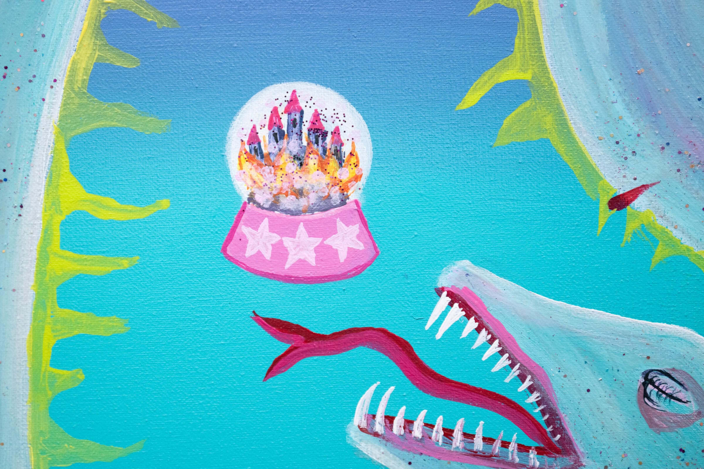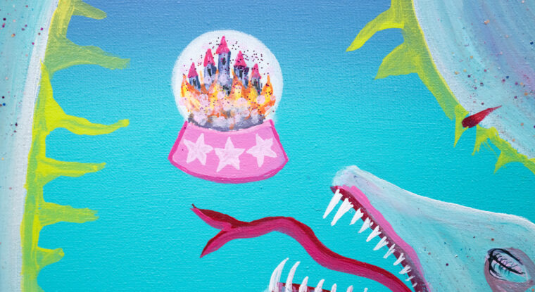 Strakošová’s motifs are inspired by primitive symbols, children’s naïve art and contemporary trends from the online world. She repeatedly chooses themes that possess multiple meanings. Typical examples include the cloud (a symbol of mystery, but also hope, as when the sun comes out after a storm) and fire as a symbol of energy and passion, but also danger and ruin. We shouldn’t forget that fire not only destroys – it also gives life. Another common element in the artist’s work are dragons. They can be seen as fairy-tale creatures guarding a treasure or a princess, but also as symbols of wisdom, fortune, strength and being in harmony with nature. At the same time, they can represent destruction, chaos, power and rule. In psychology, dragons stand for the archetype of the shadow – the suppression of certain forces in the human mind, of our inner demons. Another motif that Strakošová likes to use is the heart, specifically the heart symbol. One of the most universal and most recognised shapes in the world, it represents love and tenderness and embodies life, but it can also stand for a broken, wounded heart. One might say that there are dragons dancing in the heart of CHMURKA, and whenever a dark cloud appears in her world, flowing tears are transformed into little hearts and glitter.