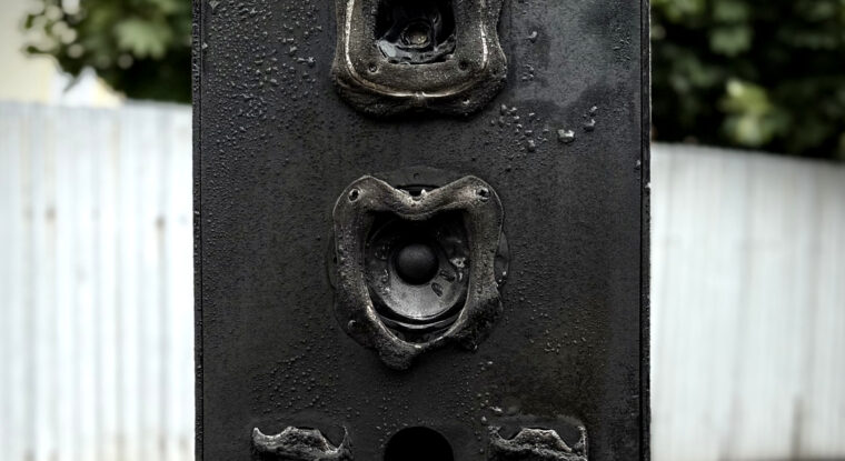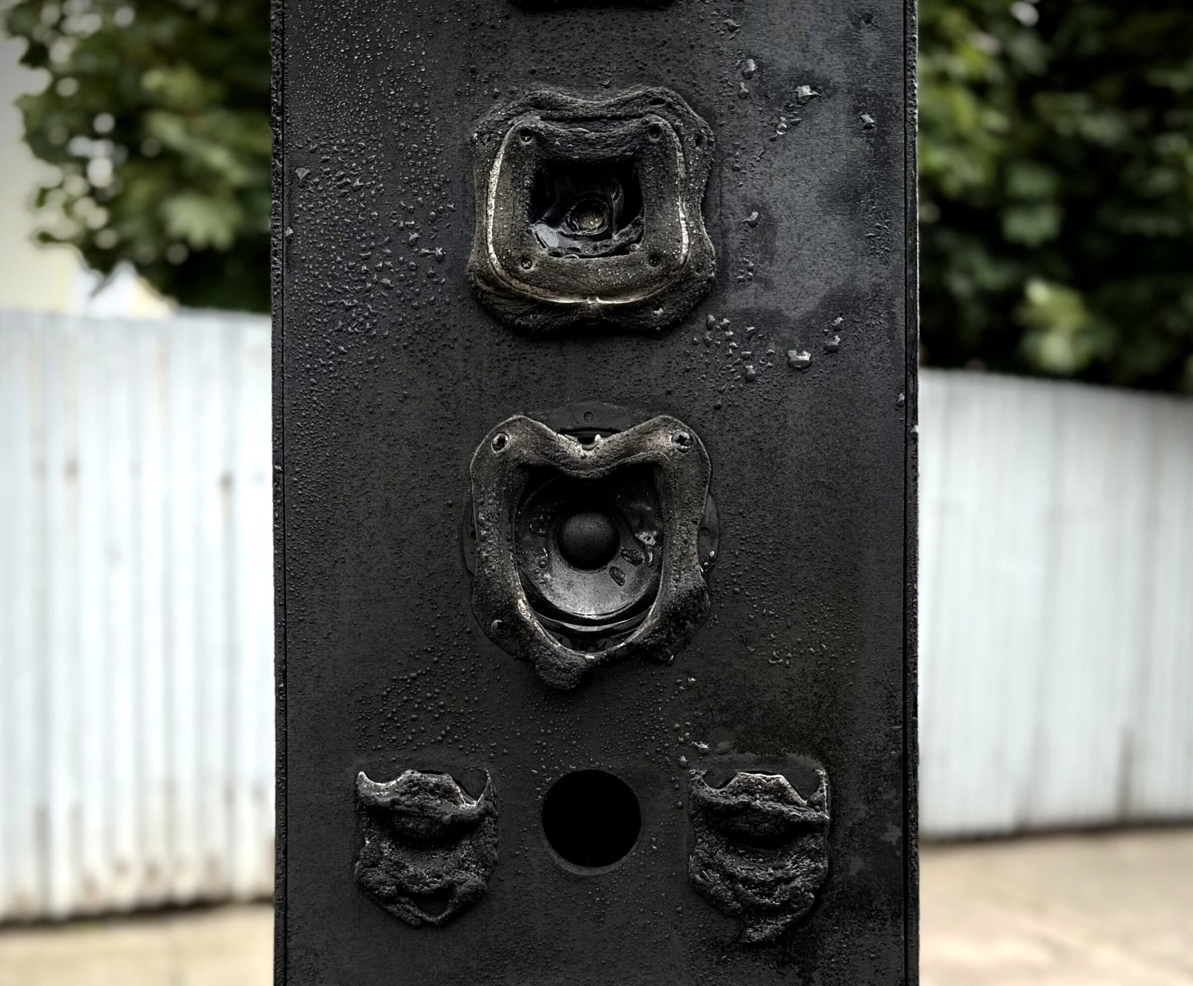 The installation titled Melanosis depicts a landscape afflicted by fire – raw, transformed, but still alive. More than a silent object, it is also a pulsating body that responds and communicates. The scorched landscape of audio speakers is not just an entity of observation, it is an active component of relational ecology – a space for rediscovering the body, consciousness and nature, including its death and resurrection. A fire can seriously interrupt ecological and visual continuity, but it can also help to reset the ecosystem and return it to an earlier stage of succession (a state in which the landscape finds itself in a period of renewal or transition). The connection between the functioning of a forest and the inner world of people is a tenet of ecopsychology – a field that explores how the environment influences our psyche and our mental health.
