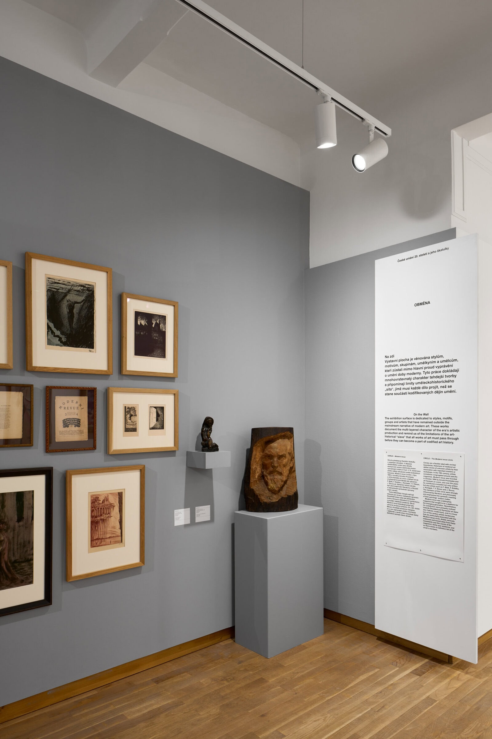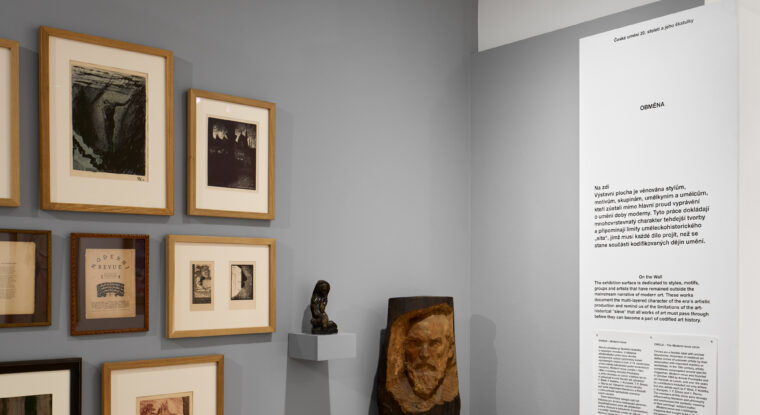 Výstavní plocha Na zdi, která je součástí stálé expozice České umění 20. století a jeho škatulky, je věnována stylům, motivům, skupinám, umělkyním a umělcům, kteří zůstali mimo hlavní proud vyprávění o umění doby moderny. Tyto práce dokládají mnohovrstevnatý charakter tehdejší tvorby a připomínají limity uměleckohistorického „síta“, jímž musí každé dílo projít, než se stane součástí kodifikovaných dějin umění.